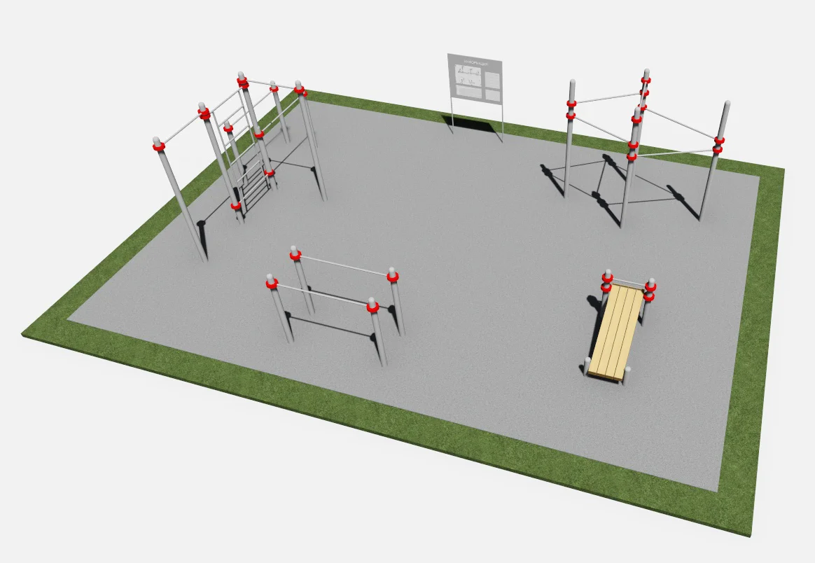 Спортивная площадка включает тренажеры: Б001, СК002, Т008, Б010, Т016.