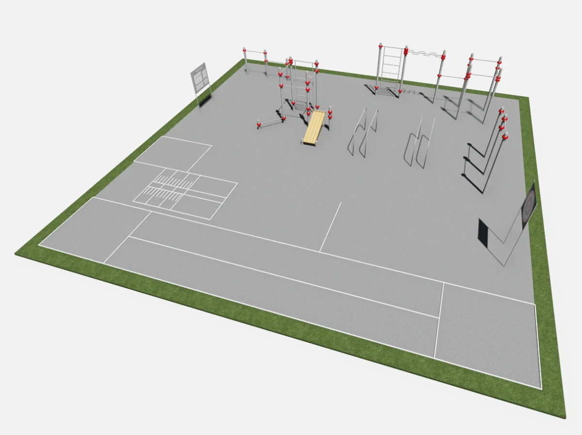 Спортивная площадка включает тренажеры: Б010, Б011, Ш004, Б004-2 шт., СК005, Т002, Т005.