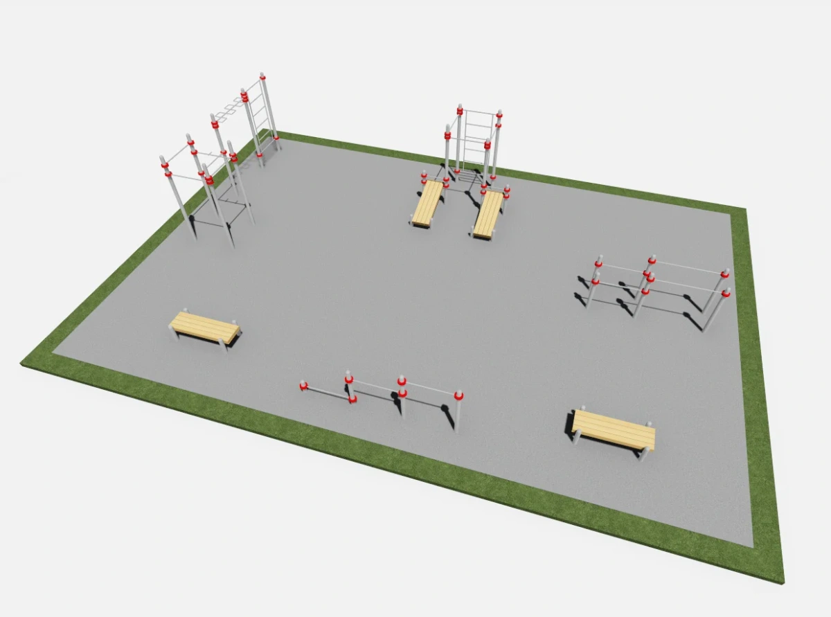 Спортивная площадка включает тренажеры: СК001 – 2шт., Т005, СК003, Ш004, Б003.