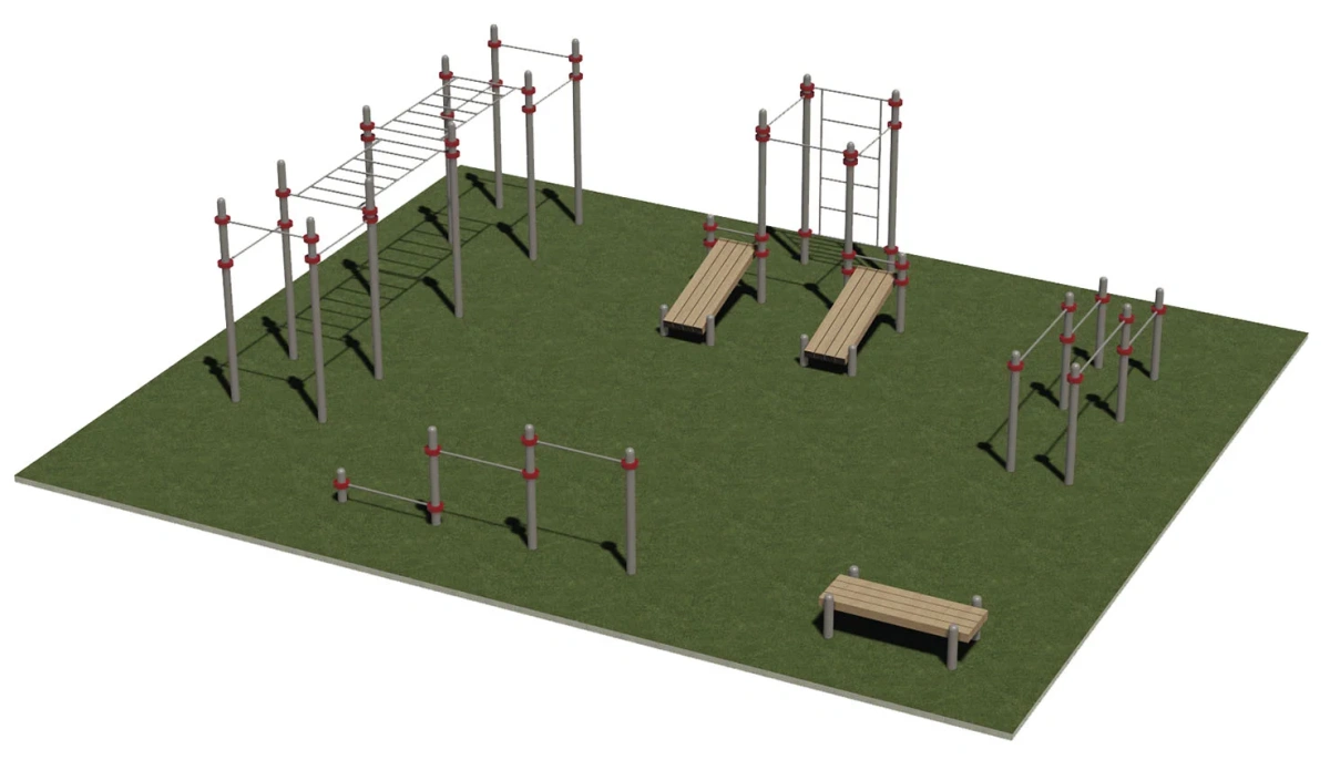 Спортивная площадка включает тренажеры: Р002, Т005, СК001, Б003 и СК003.