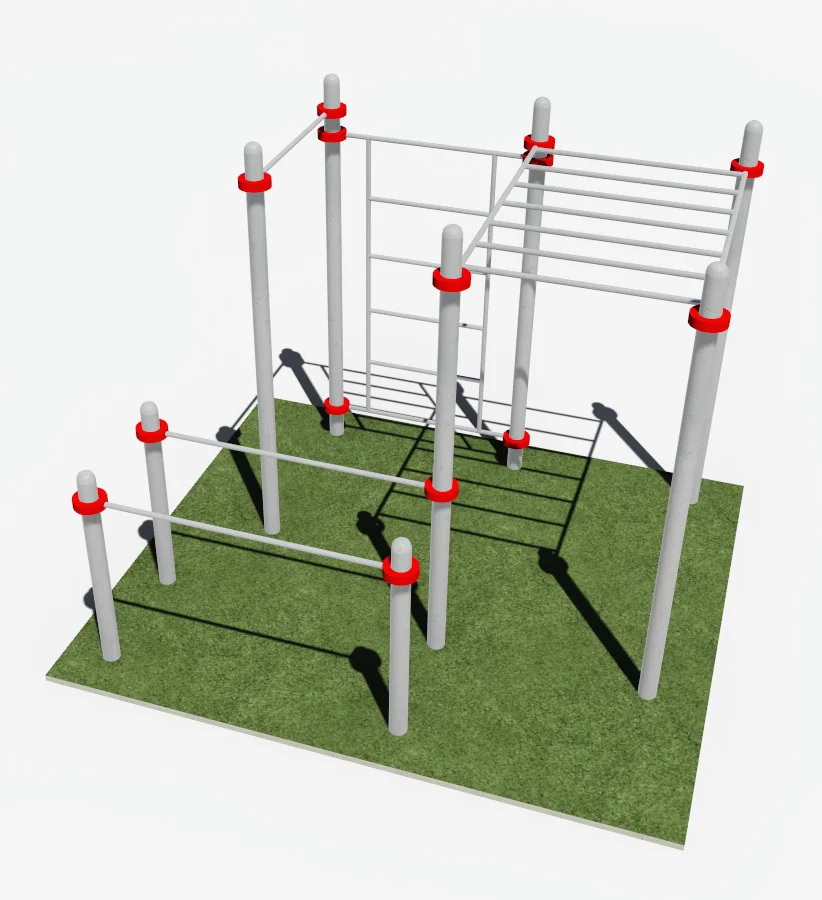 К опорным столбам высотой 2600 мм в количестве 6 единиц крепится на высоте от уровня основания: 2450 мм -рукоход классический, 2300 мм- шведская стенка. Ширина шведской стенки и рукохода составляет 1200 мм. Длина рукохода 2070 мм. Высота шведской стенки 2000 мм. Два столба высотой 1500 мм от уровня основания составляют опору для фиксации горизонтальных перекладин (длиной 1700 мм) брусьев. Все составляющие комплекса крепятся между собой при помощи хомутов. Общая длина комплекса составляет не более 3500 м.